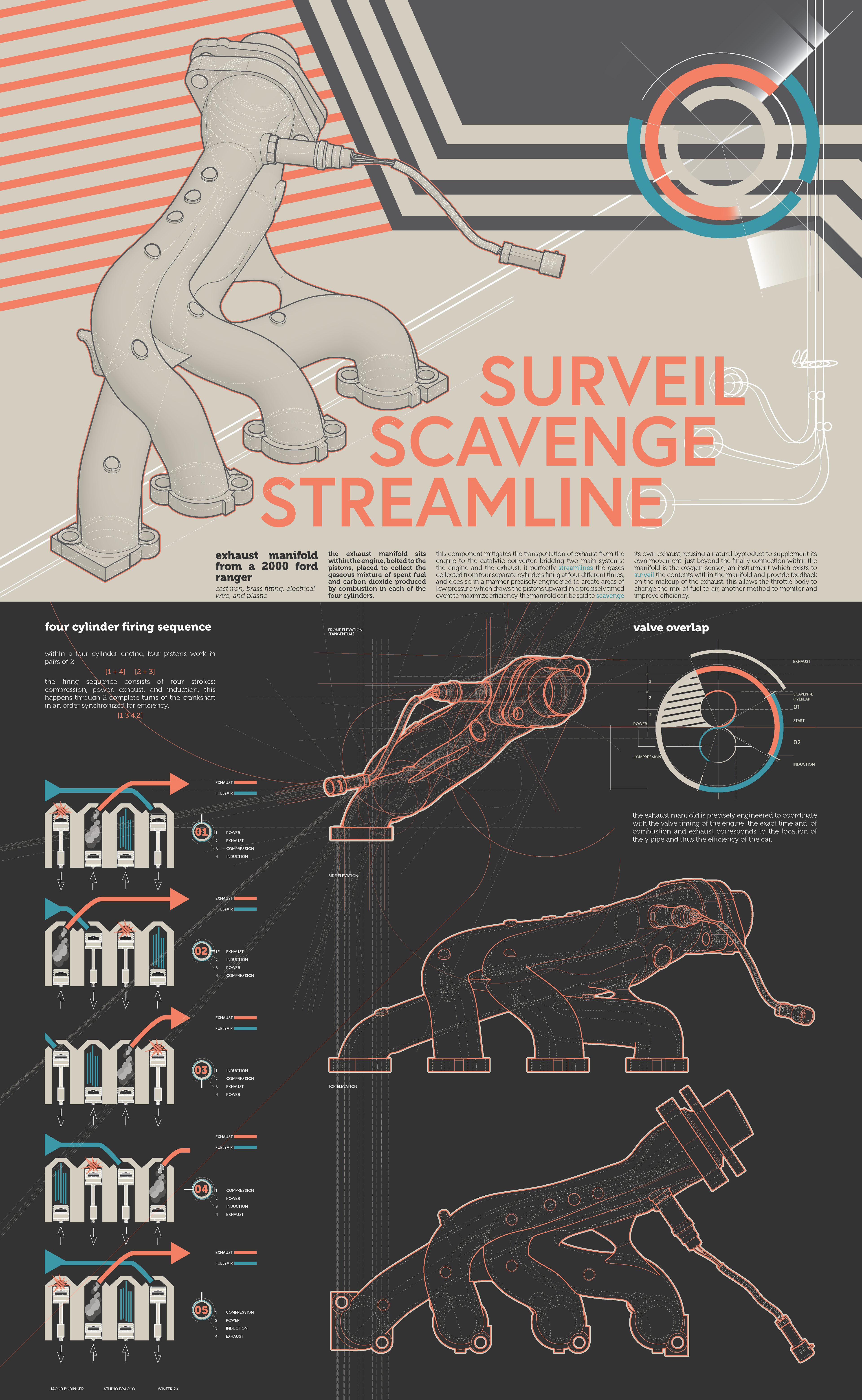 A warm up project for Angela Bracco's Second Year Studio. The assignment was to buy a car part from a u-pull-it shop, model it in rhino, and create drawings and diagrams of the car part.