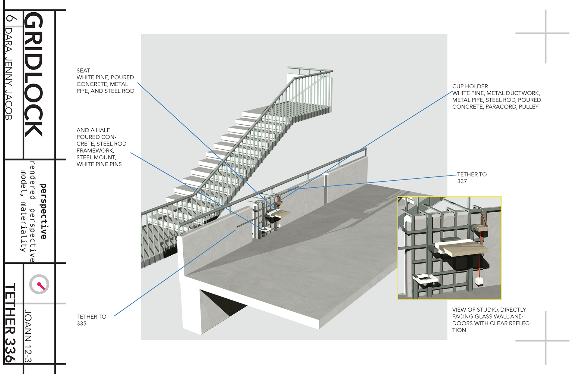 A four week project from JoAnn Moore's first year studio. This was a group project with Jenny Viveros and Dara Linn. Constructed from reinforced concrete, steel, wood, and paracord.